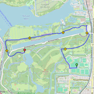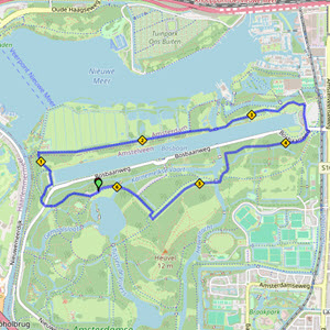 We starten bij cricketvereniging VRA in het Amsterdamse Bos. Vanuit het stadion van VRA lopen we via de Nieuwe Kalfjeslaan en het Bezoekerscentrum naar de kop van de Bosbaan. Daar lopen we langs café De Bosbaan en voorbij het café slaan we bij de Koenenkade linksaf. Via de Koenenkade lopen we langs boerderij Meerzicht richting de Grote Speelvijver. Aan het eind van de Duizendmeterweg, vlak bij de kiosk, is een verzorgingspost ingericht.